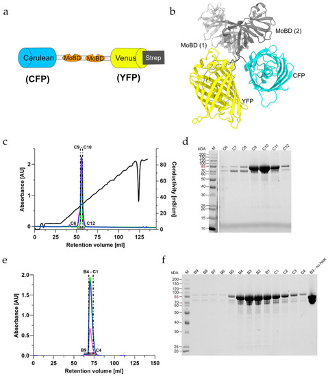 The MolyProbe-Strep clone was created exactly as described in the Materials and Methods section. After cloning, the plasmids were transformed into Escherichia coli NEB5α cells (New England Biolabs). A 30 h culture was used to express the protein and to purify it via Strep-TagII affinity chromatography for expression. The different fractions of the purification process were collected and separated in an SDS-PAGE (Figure S1), monitoring the success of the expression and the purity of the protein. The MolyProbe migrated at an estimated size of 85 kDa in the SDS PAGE. Extended purification with additional washing steps through high salt buffers in the affinity chromatography was used to optimize the purity of the protein yielded. As a next step, anion-exchange and size-exclusion chromatography were performed to characterize the purified protein and to perceive if the samples were free of other protein contaminations. The MolyProbe gene codes for two fluorescence proteins (FP), CFP and YFP, which have an absorbance peak at 434 nm (CFP) and 515 nm (YFP), respectively. These MolyProbe-specific absorbances could be monitored additionally at 280 nm. For anion-exchange column chromatography, one major peak with a MolyProbe-specific absorbance after ~30 mS/cm conductivity was reached (Figure 1c). The peak fronted slightly, pointing to an overloaded column or a possible sample degradation. The corresponding SDS-PAGE separated the peaks’ fractions (Figure 1d) and showed a prominent 85 kDa protein band, especially in the fractions C9–C11. Size-exclusion chromatography purification displayed a single major peak observable with slight tailing (Figure 1e). The SDS-PAGE of the fractions showed a similar picture compared to the anion-exchange chromatography protein (Figure 1f). Excitingly, fragmentation did not occur when the protein sample was not heated before loading the gel. Affinity purification yielded roughly 5 mg of protein per liter of expression culture.
