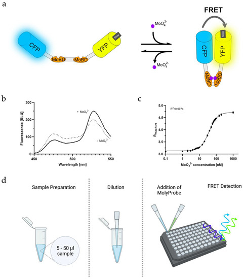 In-vitro-based molybdate detection assay: (a) Schematic representation of the MolyProbe-Strep reaction with molybdate, binding two molybdate ions per molecule; (b) Emission spectrum of the MolyProbe with (+) and without (−) 10 μM molybdate; (c) Large-scale measurement with 20 data points from 0.5 nM to 1 μM molybdate. The emission spectrum (450–550 nm) was measured at room temperature. An amount of 20 nM MolyProbe was used in reaction volumes of 500 μL (n = 3); (d) Preparation of a MolyProbe assay displayed, 5–50 µL sample was transferred into a new tube and diluted to 50 µL. This dilution step was repeated until an estimated molybdate concentration of 20–200 nM molybdate was reached, then 50 µL of the MolyProbe reaction buffer containing 40–320 nM MolyProbe-Strep was added to the mix. After 5 min, FRET was measured.
