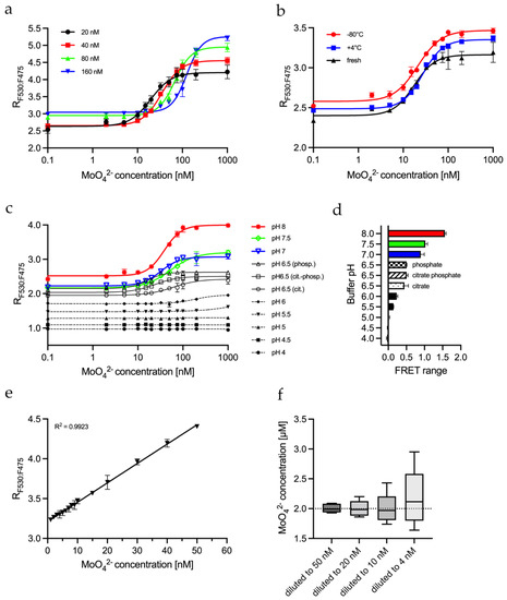 Characterization of MolyProbe-Strep parameters: (a) FRET ratio of a molybdate calibration curve analyzed with 20 nM, 40 nM, 80 nM and 160 nM MolyProbe; (b) Performance test of MolyProbe protein stored one month at +4 °C or one month at −80 °C, compared to freshly prepared protein; (c) FRET ratio was measured in different pH buffers (pH 4–6.5 citrate buffer, pH 6.5 citrate-phosphate buffer and pH 6.5–8 phosphate buffer); (d) The range of the FRET of the pH-dependent samples from (c); (e) Linear range of a concentration-dependent MolyProbe FRET assay; (f) Dilution-dependent accuracy of the MolyProbe FRET assay. An amount of 2 μM molybdate was diluted 40×, 100×, 200×, and 500× into the following concentrations, left to right: 50, 20, 10 and 4 nM, and they were extrapolated, respectively. Tukey boxes are plotted, showing the minimum, 25th percentile, median, 75th percentile, and maximum. An amount of 20 nM MolyProbe was used for all samples in a 100 µL reaction volume. The MolyProbes CFP (480 nm) and YFP (530 nm) peaks ±5 nm between 25–30 °C were measured. MolyProbe FRET ratio was plotted against the molybdate concentration. n = 3.