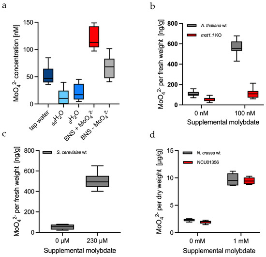 MolyProbe-Strep in vitro assay in culture media and cell extracts: (a) Water and culture media from left to right: tap water; ddH2O; dH2O; hydroponic BNS (see Materials and Methods) medium with 100 nM molybdate; hydroponic BNS medium without molybdate. n = 4; (b) Cell extracts of Arabidopsis thaliana plants cultivated in hydroponics with and without 100 nM molybdate. The roots were removed, and the remaining plant parts were collected, homogenized and measured in a 96-well plate. The A. thaliana strains that were used were molybdate transporter 1.1 knock-out (mot1.1 KO) and the Col-1 wild-type (wt) strain. Biological replicates, n = 4 (without molybdate) and n = 3 (with molybdate); (c) Cell extracts of Saccharomyces cerevisiae strain YPH499 incubated with or without 230 μM molybdate. n = 3; (d) Cell extracts of Neurospora crassa strains incubated with or without 1 mM molybdate. N. crassa strains that were used were putative molybdate transporter knock-out NCU01356 and the wild-type strain 74-OR23-1V-A (wt). Biological replicates, n = 3. The Tukey boxplots show the minimum, 25th percentile, median, 75th percentile and maximum.