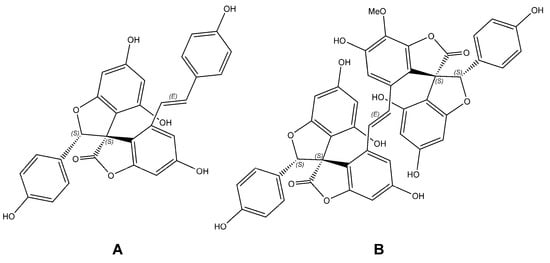 In fact, the biological activity of spiro-flavostilbenoids is still undiscovered and requires in-depth studies, which is supported by the research results so far. On the other hand, their biosynthetic precursors, namely RV and naringenin, have been well studied in in vitro, ex vivo, in vivo and clinical trials for the prevention and treatment of neurodegenerative diseases, including Alzheimer’s disease (AD) and Parkinson’s disease (PD) [16]. Importantly for the treatment of these disorders, our recent study showed weak and moderate inhibitory activity of Yus and Glos against acetylcholinesterase (AChE) and butyrylocholinesterase (BChE) in in vitro assays, respectively, [7] and YuB and GloA (Figure 1) showed the highest inhibitory capacity against both enzymes. Their IC50 values against BChE were almost 2-fold (GloA) and 1.5 (YuB) lower than those of galantamine [7].