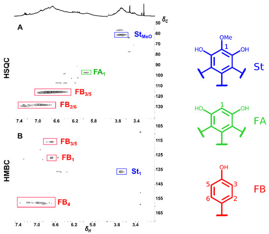 Identification of such a complex mixture of compounds is beyond the scope of this publication, nevertheless we decided to perform 2D 1H-13C HSQC and 1H-13C HMBC NMR analyses, which gave the information regarding different stilbene (St) and flavanone (FA and FB) units present in the polymeric fraction of YS (Figure 2). Signals from methoxy (MeO) belonging to THMS stilbenic moiety at δC/δH 60.66/3.56–3.86 and parahydroxyphenyl groups from ring B of flavanone moiety (FB) from C2,6/H2,6 at δC/δH 127.6–128.9/6.65–7.36 and C3,5/H3,5 at δC/δH 115.6/6.30–7.00 are dominant in the HSQC spectra, accompanied by cross peak from flavanone ring A (FA) at δC/δH 96.9/5.87–6.00 (Figure 2A). The HMBC spectrum, on the other hand, shows the connection between the methoxy group and the signal of C1 (St1) at δC 136.1, and from protons FB2/6 to carbon FB4 at δC 157.3–158.0 (Figure 2B).