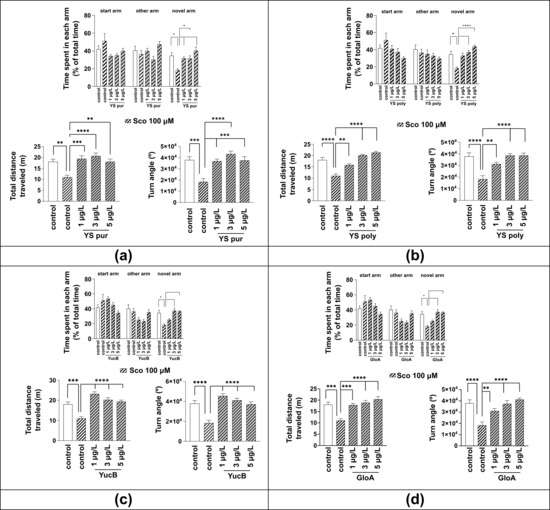 The effects of YS preparations (1, 3 and 5 μg/L) on memory and locomotor activity in scopolamine (Sco)-treated zebrafish in the Y-maze test. Memory: time spent in each arm (start, other and novel arm); Locomotion: total distance traveled and Turn angle of zebrafish in the tank in the control—untreated group; group treated with scopolamine (Sco 100 µM); groups treated with Sco (100 µM) and (a) YS pur—purified fraction; (b) YS poly—polymeric fraction; (c) YuB—yuccaol B; and (d) GloA—gloriosaol A. Values are means ± S.E.M. (n = 10). For Tukey’s post hoc analyses * p < 0.05, ** p < 0.01, *** p < 0.001, **** p < 0.0001.