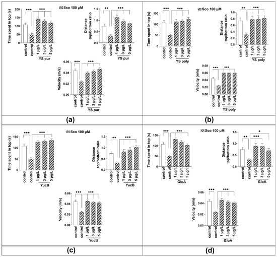 The influence of Y. schidigera preparations in scopolamine (Sco)-treated zebrafish on locomotor activity and anxiety level observed in the Novel Tank Diving Test (NTT). Anxiety response: time spent in the top (s); Locomotion: distance top/bottom ratio; and Velocity (m/s) in the control group; group treated with Sco 100 µM; groups treated with Sco (100 µM) and yucca preparations at 1, 3, 5 µg/L: (a) YS pur—purified fraction; (b) YS poly—polymeric fraction; (c) YuB—Yuccaol B; (d) GloA—Gloriosaol A. Values are means ± S.E.M. (n = 10). For Tukey’s post hoc analyses * p < 0.05, ** p < 0.01 and *** p < 0.001.