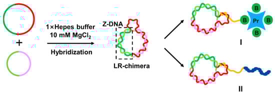 If the bio-layer interferometry (BLI), a real-time dip-and-read assay system to study biomolecular interactions, can be used to analyze Z-DNA of relatively short non-modified DNAs, it is very helpful for Z-DNA affinity analysis. The binding information is obtained by monitoring the change of light interference with time (interference spectrum) to reflect the binding dynamics between biomolecules [,]. BLI has been used to study the protein–protein interaction [,,], as well as protein–nucleic acid interaction [,,]. Obviously, construction of stable Z-DNA, which can be attached on the BLI probe, is the key technique to reach this goal. Recently, we have successfully prepared stable non-modified Z-DNA (LR-chimera involving the left-handed part and the right-handed one) under physiological ionic conditions (e.g., 10 mM MgCl2) using two complementary 74~111 bp long circular single-stranded DNA (ssDNA) []. The circularization of ssDNA is a critical step, which needs to be improved [,,,]. In addition, the LR-chimera we prepared is difficult to attach onto the surface of the probe, because it has no ssDNA part for further hybridization. This inspired us to prepare LR-chimeras with an ssDNA loop for attaching it to the BLI probe (Figure 1).