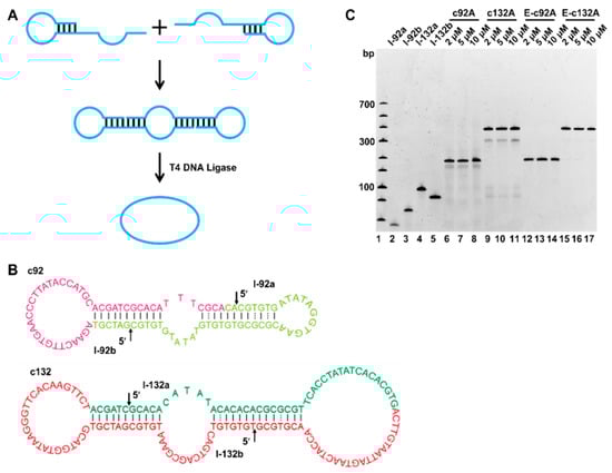 The preparation of an LR-chimera for comprehensive analysis requires a relatively large amount of circular ssDNAs. For efficient preparation of an LR-chimera consisting of two circular ssDNAs, we first developed a new circularization approach to completely suppress the polymeric byproducts (Figure 2). At present, researchers have significantly improved the circularization efficiency by reducing MgCl2 concentration [], using the terminal hairpin of the ssDNA substrate [] or frozen/lyophilization/cyclization (FLC) []. Sui et al. reported a one-pot ligation method to efficiently prepare longer circular ssDNA (>90 nt) [], but several splints were needed, and the yield was not high enough in some cases. In our new approach presented here, each ssDNA circle was synthesized by using two fragments, which could hybridize with each other to form two nicks (Figure 2A). After ligation by T4 DNA ligase, a circular ssDNA with two hairpin-like structures could be formed. As shown in Figure 2B, for efficient ligation, a 5~7 bp duplex part (T−G mismatches are also involved) was designed on either side of the nick. Mismatches are designed to promote later hybridization between two prepared circular ssDNAs. Concretely, a 92 nt long circular ssDNA (c92A) was obtained from two linear strands of l-92a (40 nt) and l-92b (52 nt), whose hairpin stems were 6 bp long. The stems for l-132a and l-132b (two fragments of 70 and 62 nt length to obtain the 132 nt long circular ssDNA of c132A) were 7 and 6 bp, respectively. After hybridization of these two fragments, two nicks were formed for circularization (see arrows in Figure 2B).
