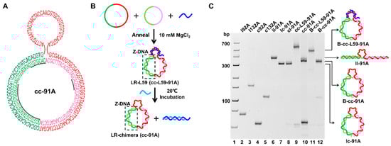 In our previous studies on LR-chimera [,], two circular ssDNAs were prepared with splints, and byproducts had to be removed with gel purification. In this study, the two ssDNAs to form cc-91A were circularized without the necessity of adding splints. This circularization method can achieve the preparation of circular ssDNA with high concentration (up to 10 μM) and high yield without polymeric byproducts. Although the stable intra-molecular secondary structure is not conducive to the hybridization of these two circular ssDNAs, the hybridization can be carried out efficiently with the aid of an oligonucleotide (L59) to hybridize to the loop. The aid oligonucleotide can be removed, and the formed LR-chimera is very stable.