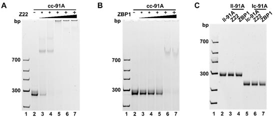 The Z22 antibody is usually used to prove the presence of Z-DNA because it can specifically recognize and bind to Z-DNA with high affinity and no sequence specificity [,]. Here, we also used Z22 to verify whether left-handed DNA was formed in cc-91A. The results of Z22 binding to cc-91A are shown in Figure 4A. With the increase of Z22 concentration, the band for cc-91A disappeared gradually, and new bands with lower mobility were observed, indicating that Z22 binds to cc-91A. Interestingly, when the Z22 concentration was as low as 0.25 μM (lane 3, Figure 4B), there was a clear product band (lane 3, Figure 4A), indicating that only one Z22 molecule bound to each cc-91A molecule. For 0.50 μM, another weak band was observed (lane 4), implying that two Z22 molecules may bind to cc-91A. When Z22 concentration increased to 0.75 μM or higher, the mobility of the complex of Z22 and cc-91A was almost zero, and bands were observed only in the well of gel (lanes 5−7), indicating that three or more Z22 molecules bound to cc-91A.