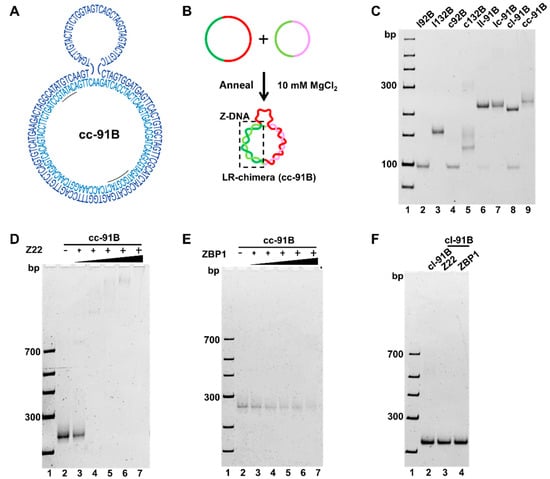 One of our aims is to construct an LR-chimera (cc-91A) with an extra ssDNA part as a hanging hook to attach it to other molecules (Figure 1). As shown in Figure 3A, the sequence of the targeted LR-chimera contains an APP-rich part involving two continuous APP sequences of 24 and 8 bp to form stable Z-DNA (see the underlined part in Figure 3A). The ssDNA hook was 41 nt long, and the complementary parts between the two ssDNA circles were 91 nt long. After hybridization, an extra adenylate (dA) was present on c92A, and the extra 41-nt-long ssDNA part on c132A was used as the ssDNA hook. Actually, it is a challenge to hybridize these two circular ssDNAs (Figure 3), because our newly designed circular ssDNAs can form stable intra-molecular secondary structures, as we mentioned above (Figure 2B). When we just mixed c92A and c132A, no new band for the hybrid of cc-91A was observed, indicating that almost no hybridization occurred (data not shown).