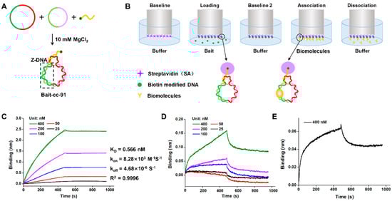 A linear ssDNA attaching 5’-terminal biotin was used to immobilize the LR-chimera to the biosensor surface coating with streptavidin (Figure 6A). The hybrid complex of the LR-chimera and the biotin-modified ssDNA was designated as Bait-cc-91 (Bait-cc-91A and Bait-cc-91B for cc-91A and cc-91B, respectively). The hybridization for Bait preparation was simply carried out by mixing the corresponding LR-chimera and the biotin-modified ssDNA, and the controls of B-form DNAs (Bait-ll and Bait-lc) were also prepared (Supplementary Figure S2). The affinity between Z-DNA and ZBP1 protein was evaluated using BLI by the protocol shown in Figure 6B. After loading (immobilization of Bait to the biosensor) and washing away unattached LR-chimera molecules, association (binding of ZBP1 to LR-chimera) and dissociation (dissociation of ZBP1 from LR-chimera) steps were carried out. The binding buffer contains 10 mM phosphate (pH 7.2), 10 mM MgCl2, 0.1% BSA, and 0.02% Tween-20 (BSA and Tween-20 avoid non-specific binding). The real-time binding curves of various concentrations of ZBP1 and LR-chimera are show in Figure 6C,D. The optimized Bait concentration was determined to be 20 nM, and the loading time was 240 s.