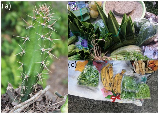 (a): Young stems of Acanthocereus tetragonus growing in the wild. (b,c): A. tetragonus and other vegetables produced by familiar farms and sold in local markets in northern Veracruz, México.