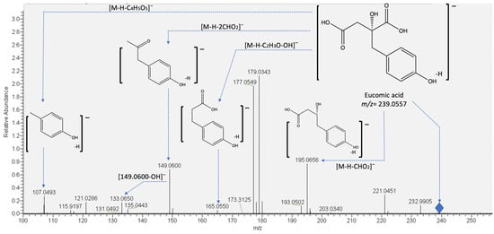 On the other hand, compounds 9 and 10 were identified as eucomic acid isomers, as reported by Hernández, et al. [27]. This metabolite showed the highest relative abundance in the chromatogram (see Figure 2). For this compound, the pseudomolecular ion generated fragments at m/z 195.0656, 149.0600 133.0654, and 107.0502 (see Figure 3), and according to its relative abundance, it may correspond to one of the main metabolites present in crude and cooked samples of A. tetragonus, similar to that found for Opuntia ficus indica cladodes [28] and peel [29]. Eucomic acid has been previously reported in Opuntia ficus indica cladodes [30] and fruits [27] and as a key compound in leaf-opening processes in other plant species such as Lotus japonicus (Fabaceae) [31].