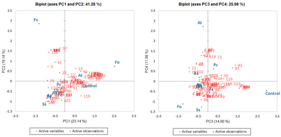 As the result of data analysis obtained from HS-SPME-GC-MS measurements, a total of 130 compounds were identified. The detailed results of these findings are summarized in Table S1. The results were expressed as means of peak area % from duplicate analysis of each sample. The relationships among different phytopathogens used to contaminate potato tubers and volatile compounds after 14 days of storage were determined using a PCA analysis. The principal component analysis (PCA) was carried out using the relative content (% peak area) of volatile compounds as variables. A double criterion was applied to estimate the number of PCA factors that significantly affect the total variance: the own value chart and own values > 1. Using the above criteria, the four PC factors were identified, which explained 67.26% of the total variance.