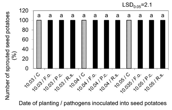 Percentage of the Impresja sprouted seed potatoes at 20 °C after storage at 4 °C from harvest until inoculation with phytopathogens on 10 February and then at 15 °C and 80% RH before planting in the soil on 10 March, 10 April, and 10 May. C—Control, Fo—F. oxysporum, Pc—P. corotovorum, Rs—R. solani. Means marked with the same letters do not differ statistically at the significance level p = 0.05. LSD was calculated at the significance level of p = 0.05.