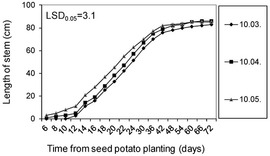 Growth kinetics of Impresja potato stems obtained from seed potatoes stored at 4 °C from harvest until 10 February of the following year and then at 15 °C and 80% RH until planting in the soil on 10 March, 10 April, and 10 May. LSD was calculated at the significance level of p = 0.05.