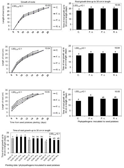 Kinetics of root growth and time of its growth up to 30 cm in length, as affected by the seed potatoes storage at 4 °C from harvest until inoculation with phytopathogens on 10 February and then at 15 °C and 80% RH before planting in the soil on 10 March, 10 April, and 10 May. C—Control, Fo—F. oxysporum, Pc—P. corotovorum, Rs—R. solani. Means marked with the same letters do not differ statistically at the significance level p = 0.05. LSD was calculated at the significance level of p = 0.05.