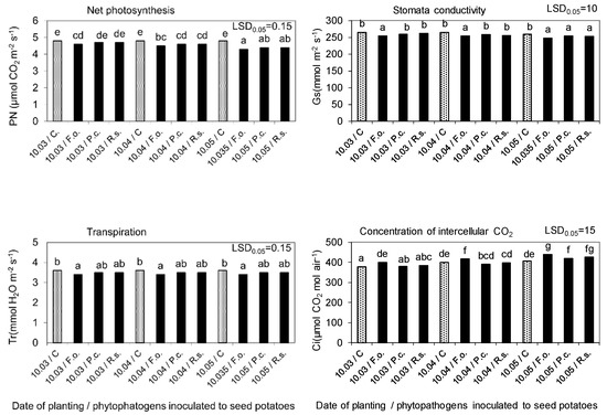 Gas exchange in potato leaves, as affected by seed potatoes storage at 4 °C from harvest until inoculation with phytopathogens on 10 February and then at 15 °C and 80% RH before planting in the soil on 10 March, 10 April, and 10 May. C—Control, Fo—F. oxysporum, Pc—P. corotovorum, Rs—R. solani. Means marked with the same letters do not differ statistically at the significance level p = 0.05. LSD was calculated at the significance level of p = 0.05.