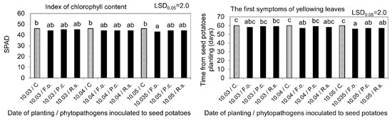 Index of chlorophyll content and first symptoms of their yellowing, as affected by seed potatoes storage at 4 °C from harvest until inoculation with phytopathogens on 10 February and then at 15 °C and 80% RH before planting in the soil on 10 March, 10 April, and 10 May. C—Control, Fo—F. oxysporum, Pc—P. corotovorum, Rs—R. solani. Means marked with the same letters do not differ statistically at the significance level p = 0.05. LSD was calculated at the significance level of p = 0.05.