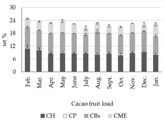 Figure 2 shows the seasonal percentage by weight variation of cacao beans (CBs), cacao placenta (CP), and cacao fruit husk (CH), of twelve cacao fruit loads (one tonne each), gathered over the months of February to January, using the traditional cacao fruit-processing scheme (Figure 1). Table S1 of the Supplementary Information contains detailed wt % data for fresh CH, CP, and CBs in every cacao-fruit load processed. The percentage by weight values reported in Figure 2 correspond to the fresh (wet) by-products with respect to the fresh fruit weight. Fresh CH is by far the most abundant cacao fruit byproduct, with a total average of 66.96 ± 2.83 wt %, followed by fresh CBs, with 24.55 ± 1.51 wt %, and CP, with 2.58 ± 0.22 wt %. The losses (5.93 ± 3.15 wt %) correspond to missing CH pieces and spoiled fruits and beans. These percentages are similar to those reported for cacao fruit from Bundibugyo District in Uganda (clone not specified) [8], for cacao fruit samples from Ghana (clone not specified) [36], and for cacao fruit from plantations located in Perak, Malaysia (clone not specified) [37]. The percentage by weight of the fresh by-products did not change significantly for cacao fruit loads gathered over the course of one year, as seen in Figure 2.
