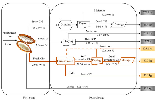 Mass balance for 1 tonne of fresh cacao fruit during the first and second stages of processing (load: Nov.).