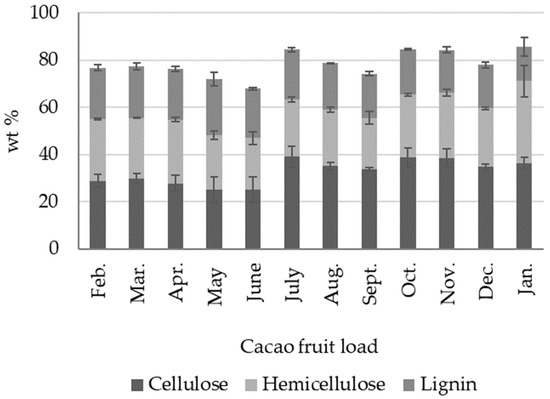 The structural biopolymers in CH showed variations over the one-year period considered in this work, as seen in Figure 6. The cellulose contents in CH ranged from 22 to 35 wt % and hemicellulose ranged from 14 to 24 wt %. Lignin content, on the other hand, exhibited significant variability, with values ranging from 25 to 39 wt %. Table S3 of the Supplementary Information contains detailed wt % compositional data for the structural biopolymers and lignin in fresh CH, as fractions of the total solids, for each cacao fruit load. The cellulose, hemicellulose, and lignin contents in cacao fruit can be influenced by factors such as location, tree age, and growth conditions. In Colombia, the cacao crop generally has two harvest seasons per year [2]. The highest productivity season ranges from October to January, while an additional, lower-productivity season runs from April to June. We observed increased cellulose and lignin contents in CH during the October–January harvest season.