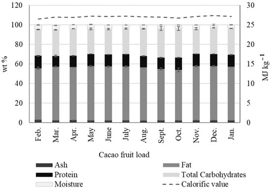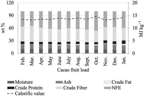 The proximal analysis for sun-dried CH belonging to individual cacao loads shows no significant seasonal variations, as seen in Figure 6 (Table S5). Only in some exceptional cases is there a significant change. For instance, in load 12 (January), the moisture percentage was low (6.62 wt %) and the protein content was high (8.08 wt %) compared to the average of the values. Likewise, load 2 (March) showed a low fat content (0.57 wt %) and a high percentage of crude fiber (37.92 wt %). Sun-dried CH calorific values ranged from 13.22 (Mar) to 14.62 (Oct), with an average of 13.69 ± 0.43 MJ kg −1 (Table S5, Figure 7). The direct combustion of sun-dried CH is common for energy generation in cacao-producing countries. Compared to other residual biomass sources, such as soybean cake, rapeseed, cotton cake, potato peel, apricot bagasse, and peach bagasse, with values from 15.41 to 19.52 MJ kg −1 [57], the calorific value of sun-dried CH is slightly lower, with an average value of 13.69 ± 0.43 MJ kg −1.