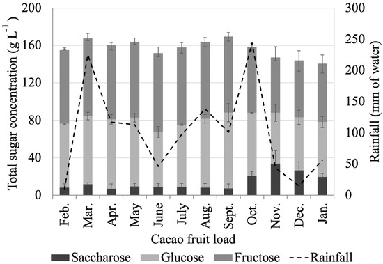There are significant differences between individual sugars in CME from different cacao fruit loads, as seen in Figure 10. The saccharose content ranged from 6.84 g L−1 to 33.7 g L−1, while the glucose and fructose contents stretched from 54.3 g L−1 to 80.89 g L−1 and from 59.3 g L−1 to 84.43 g L−1, respectively. The content of the most complex sugar in CME (saccharose) increases, at the expense of a decreased content of glucose and fructose during the main harvest (October–December), which is also the dry season in the region. However, from October to December, we also registered the lowest total carbohydrate content in CME. Sugar concentration in CME depends on many factors, such as fruit ripeness, rainfall, crop conditions, the time of year, and cacao variety, among others. Sugar accumulation can be enhanced by more prolonged exposure of the fruit to the sun [75]. A Pearson’s correlation coefficient (r) of 0.63 suggests a direct correlation between the sugar content in CME and rainfall in the area. The CME extracted from cacao fruit loads processed during November, December, and January exhibit the lowest sugar content, matching up with the dry season (low rainfall). On the other hand, during the rainy season (March to October—an abnormally long rainy season), we observed the highest total sugar content. Table S8 of the Supplementary Information contains detailed seasonal compositional information for CME.