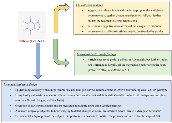 This review found suggestive evidence in clinical studies to propose that caffeine is neuroprotective against dementia and possibly AD, but further studies are required to strengthen this link (Figure 1). The clinical studies also point out that caffeine is a cognitive normalizer and not a cognitive enhancer. Although clinical studies show that the neuroprotective effect of caffeine may be confounded by gender, it is not conclusive. The review also found strong evidence based on in vivo and in vitro studies that caffeine has some positive effects in AD models, but further studies are warranted to identify all the mechanistic pathways of the neuroprotective effect of caffeine in AD.