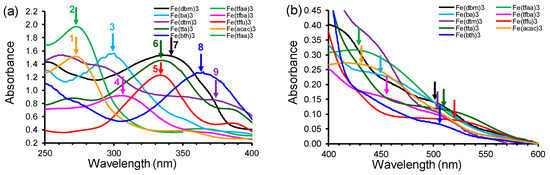 The values of Fe(III/II) redox couple of complexes 1–9 have previously been reported by us [16]. To explore the UV-Vis spectral changes associated with the reduction of [Fe(β-diketonato)3] complexes 1–9, an in situ spectroelectrochemical (SEC) study was conducted on the complexes. The spectral changes during the reduction of [Fe(β-diketonato)3] complexes 1–9 are shown in Figure 8 (UV-Vis group 1), Figure 9 (UV-Vis group 2) and Figure 10 (UV-Vis group 3), with the main changes indicated with arrows.