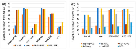 Absolute difference between the DFT-calculated maximum wavelength (λA,max(calc) in nm) and the experimental value λA,max(experimental) = 270 nm of [Fe(acac)3], complex 1, using the indicated DFT functional and basis set combinations. Graph in (a) illustrates the influence of the basis set, and in (b) the influence of the functional, on the absolute deviation of λmax(calc) from λmax(experimental).