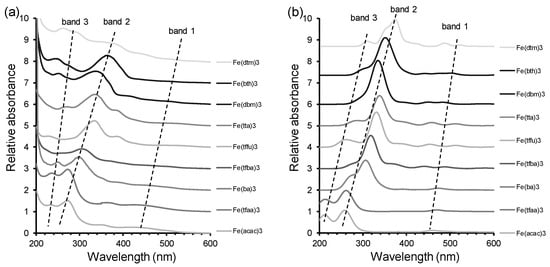 - [Fe(acac)3] (1) (270 nm) → [Fe(ba)3] (3) (298 nm) → [Fe(dbm)3] (7) (336 nm)
