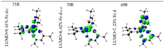 To get insight into the type of charge transfer (CT) bands observed in the experimental UV-Vis spectra of 1–10, the MOs involved in the transitions were evaluated. In Table 2 and Table S2, selected calculated excitation energy (E), wavelength (λ), oscillator strengths (f) and assignments of main transitions involved in the excitation of complexes 1, 7 and 9 are given with the MOs involved in the transitions, visualized in Figure 4, Figure 5 and Figure 6. For [Fe(acac)3] (1), [Fe(dbm)3] (7) and [Fe(dtm)3] (9), the maximum absorbance transition (band 2, λA,max) involves excitation from ligand-based occupied MOs to mainly metal-based unoccupied MOs, thus mainly ligand-to-metal charge transfer (LMCT). Transitions at energies higher than that of the maximum absorbance transition (band 3) also have some ligand-to-ligand charge transfer (LLCT) characteristics. Similarly, band 1 and 2 transitions of complexes 2–8 and 10 are mainly LMCT, and band 3 are LLCT.