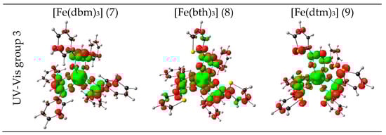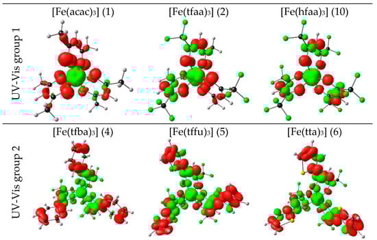 For further insight into the intramolecular charge transfer process during excitation of the maximum absorbance band, electronic density difference (EDD) plots to show the direction of the charge transfer between the ground and excited state of the maximum absorbance peak were determined and visualized in Figure 7. The region of electron density depletion (indicated with red) for all complexes is localized on the β-diketonato ligands. The region where the electron density increases (green color) is mainly on Fe(III), but also partially on the β-diketonato ligands. The EDD plots thus confirm that the maximum absorbance excitations are mainly LMCT. For the UV-Vis group 2 and 3 complexes that contain aromatic groups, the region of electron density decrease also occurs on the aromatic groups, all of pi character. Due to the symmetrical nature of the EDD plots, excitation would result in a serious intramolecular electron recombination, in agreement with the short excited state lifetimes calculated for the excited states (see Table 3 and the discussion in Section 2.1.3).