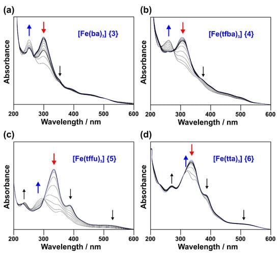 In Figure 9a, the spectral changes during the reduction of [Fe(ba)3] (3) are shown. This complex has a strong band at 298 nm and a smaller band at 250 nm. Upon reduction of the complex, the 298 and 250 nm bands, respectively, decrease and increase in intensity. Two isobestic points are visible at 230 and 265 nm (between 200 and 250 nm). In Figure 9b, the spectral changes during the reduction of [Fe(tfba)3] (4) are shown. This complex has a strong band at 304 nm and a shoulder at 259 nm. Upon reduction of the complex, the 304 and 259 nm bands, respectively, decrease and increase in intensity. Two isobestic points are visible at 230 nm and 275 nm (between 200 and 300 nm). In Figure 9c, the spectral changes during the reduction of [Fe(tffu)3] (5) are shown. This complex has a strong band at 333 nm, two smaller bands at 230 and 385 nm and a shoulder at ~520 nm. Upon reduction of the complex, the 333, 385 and ~520 nm bands disappear completely. A new strong band at 295 nm and a shoulder at 350 nm appear. The 230 nm band increases with a redshift of 5 nm. Two isobestic points are visible at 230 and 300 nm. In Figure 9d, the spectral changes during the reduction of [Fe(tta)3] (6) are shown. This complex has a strong band at 333 nm, a smaller band at 270 nm and a shoulder at 385 nm. Upon reduction of the complex, the 333 nm band decreases in intensity to form a band at 320 nm with a shoulder at 350 nm. The shoulder at 385 nm also decreases in intensity. The band at 270 nm slightly increases in intensity and a new shoulder at 230 nm appears. Two isobestic points are visible at 225 and 300 nm.