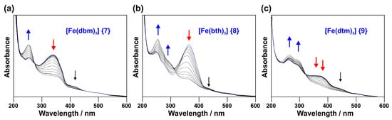 In Figure 10a, the spectral changes during the reduction of [Fe(dbm)3] (7) are shown. This complex has a strong band at 336 nm, a smaller band at 251 nm and a shoulder at 415 nm. Upon reduction of the complex, the 336 nm band decreases in intensity and the shoulder at 415 nm disappears completely. The 251 nm band increases in intensity with a slight blueshift of 3 nm. One isobestic point is visible at 270 nm. In Figure 10b, the spectral changes during the reduction of [Fe(bth)3] (8) are shown. This complex has a strong band at 361 nm, a smaller band at 245 nm and a shoulder at 275 nm. Upon reduction of the complex, the 361 nm band decreases in intensity. The 245 nm band initially slightly decreases with a redshift of 10 nm, and then strongly increases at 255 nm. The shoulder at 275 nm increases with a redshift of 25 nm. One isobestic point is visible at ~300 nm. In Figure 10c, the spectral changes during the reduction of [Fe(dtm)3] (9) are shown. This complex has a band at 260 nm and four shoulders at 295, 350, 375 and 445 nm. Upon reduction of the complex, the 350, 375 and 445 nm shoulders decrease in intensity and the 260 nm band with the 295 nm shoulder increases in intensity. One isobestic point is visible at 320 nm.