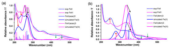 In comparing the spectral changes during the one-electron Fe(III)/Fe(II) reduction of complexes 1–9, the maximum absorbance peak of all the Fe(III) complexes decreases (indicated with red arrows in the Figure 8, Figure 9 and Figure 10). A new maximum absorbance peak associated with Fe(II) forms at a lower wavelength (indicated with blue arrows in the Figure 8, Figure 9 and Figure 10). For the thienyl- and furyl-containing complexes 5, 6, 8 and 9, two new absorbance peaks associated with Fe(II) form at the lower wavelength. The absorbance peak associated with Fe(II) that forms at the lower wavelength decreases in intensity for the UV-Vis group 1 complexes, while it increases in intensity for the UV-Vis group 2 and group 3 complexes. This peak might be related to the pi orbitals on the aromatic groups of complexes 3–9. In Figure 11, the experimental and TDDFT UV-Vis of [FeIII(β-diketonato)3] and [FeII(β-diketonato)3]− are compared for β-diketonato = acac (complex 1, without any aromatic group) and dbm (complex 9, containing aromatic groups). Both the experimental and calculated spectra of [Fe(acac)3] show similar features (Figure 11a), namely: (i) the two strong absorbance peaks in the 200–300 nm region decrease in intensity and redshift upon reduction of Fe(III), and (ii) the lower energy, higher wavelength band above 400 nm disappears upon reduction of Fe(III). Only the redshift of the small experimental peak at ca. 350 nm could not be identified in the calculated spectra. For [Fe(dbm)3], the calculated spectra reproduced the main features of the experimental spectra (Figure 11b), namely: (i) the strong absorbance peaks below 300 nm increase in intensity and blueshift upon reduction of Fe(III), (ii) the strong absorbance peaks at ca. 350 nm decrease in intensity and redshift upon reduction of Fe(III), and (iii) the lower energy, higher wavelength band above 400 nm disappears upon reduction of Fe(III).