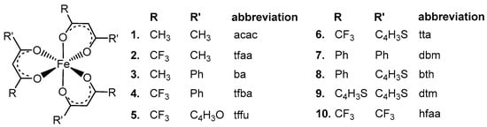 Tris(β-diketonato)iron(III) complexes represent an important class of organometallic compounds, which have been used in modern applications by many researchers in recent years. Some of the modern application areas where these compounds are used include photocatalysis [1], redox mediators in solar cells [2], energy storage (batteries) [3,4,5], catalysts, pre-catalysts and reagents in organic chemistry [6,7,8,9].
