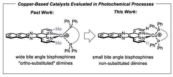 - Sosoe, J.; Cruché, C.; Morin, É.; Collins, S.K. Evaluating Heteroleptic Copper(I)-Based Complexes Bearing π-Extended Diimines in Different Photocatalytic Processes. Can. J. Chem. 2020, 98, 461–465. [Google Scholar] [CrossRef]