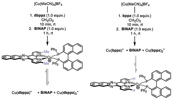 Heteroleptic complexes are typically formed by sequential addition of the diimine and bisphosphine ligands to a copper salt in a solvent, followed by precipitation. When the synthesis of heteroleptic Cu(I)-based photocatalysts using BINAP and the ligands ddpq, ddppz, or dbdppz− [27] was attempted, the resulting solids were mixtures of the corresponding hetero- and homoleptic complexes (1H-NMR and mass spectrometry, see supplementary materials) (Figure 2). Our hypothesis was that the small-bite-angle oriented the phenyl groups of the phosphine over the copper center, which is already encumbered by the methyl groups found on the diimine ligands. Attempts at conducting the synthesis in other solvents (PhME, THF, and mixtures thereof with CH2Cl2) did not result in a shift in the equilibrium between heteroleptic and homoleptic complexes. Experiments involving lower temperatures and/or slow addition of the bisphosphine were also non-productive. Repeated crystallization of crude reaction mixtures did improve the ratio of heteroleptic versus homoleptic complexes, but did not approach selectivities or yields that were synthetically useful.
