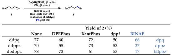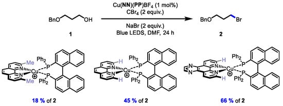 With the new BINAP-containing copper-based complexes, their evaluation in photocatalysis was performed and compared to analogous catalysts. Three mechanistically distinct photocatalytic transformations were pursued. In a visible-light Appel-type reaction (Figure 3) [28,29], the new BINAP-containing copper-based catalyst Cu(dpq)(BINAP)BF4 provided similar yields to other complexes having large-bite-angle bisphosphines. Note that control reactions performed in the absence of light or in the absence of catalyst at 450 nm did not afford any significant conversion to the alkyl bromide 2. However, as the π-surface of the ligands grew, the BINAP-containing complexes of dppz and bdppz were all inferior to analogous complexes having wide-bite-angle bisphosphines. Although the complexes of dppz and bdppz had larger excited-state reduction potentials, it is possible that the complexes with ligands with larger π-surfaces could be more unstable in solution. The stability of various copper complexes with diimines having large π-surfaces was previously shown to decrease with the size of the ligand in other photocatalytic processes [26]. However, it should be noted that amongst other BINAP-derived complexes, the Cu(dpq)(BINAP)BF4 (66% of 2) was superior in the Appel-type reaction to other structurally similar complexes such as Cu(dmp)(BINAP)BF4 (18% of 2) and Cu(phen)(BINAP)BF4 (45% of 2), suggesting that the dpq offered some beneficial reactivity (Figure 4).