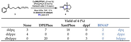 - In an energy transfer process, high yields of the desired product could be obtained with either BINAP or the dpq, dppz, and ddppz diimines through judicious choice of the accompanying ligand. For example, Cu(dmp)(BINAP)BF4 and Cu(dppz)(XantPhos)BF4 afforded quantitative yields of the product.