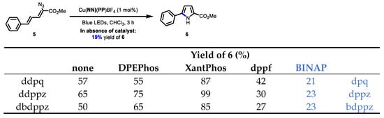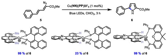 The last evaluation of the new BINAP-containing Cu-based photocatalysts was via energy transfer for the transformation of vinyl azides to the corresponding pyrrole (Figure 6) [33]. Given that the new complexes had neither wide-bite-angle phosphines or ortho-substituted diimines to stabilize the excited state, the yields of the pyrrole were expected to drop. Note that the excited-state lifetimes of the new BINAP-containing complexes were all approximately an order of magnitude less than analogous complexes (e.g., Cu(bdppz)(XantPhos)BF4 τ = 71 ns; Cu(dppz)(BINAP)BF4 τ = 1.8 ns). Indeed, the yields of the pyrrole 6 with the BINAP-containing complexes (21–23% of 6) were barely above the observed background reaction in the absence of any catalyst at 450 nm (19% of 6). A further comparison of Cu(phen)(BINAP)BF4 (38% of 6) and Cu(dpq)(BINAP)BF4 (21% of 6) showed that the dpq ligand had a deleterious effect on the energy transfer process. It should be noted that good yields of the pyrrole are possible when switching to any ligand known to extend the excited-state lifetimes (Figure 7). For example, using an ortho-substituted diimine ligand in a complex with BINAP affords quantitative yields of the product (Cu(dmp)(BINAP)BF4, 99% of 6). In addition, using a wide-bite-angle bisphosphine also affords a quantitative yield of 6 (Cu(dppz)(XantPhos)BF4, 99% of 6).