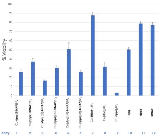 Given the recent interest in copper-containing complexes for medicinal chemistry [34,35,36], it was decided to test the most soluble of the new BINAP-containing complexes against triple-negative breast cancer cell lines (MBA-MB-231) (Figure 8). The viability of the cell lines was evaluated with the Cu(dpq)(BINAP)BF4 and Cu(dppz)(BINAP)BF4 complexes (5 μM, entries 1 and 2, respectively) and both displayed approximately 25–35% viability. Controls performed from the dpq, dppz, and BINAP ligands (entries 10–12) demonstrated that biological activity was originating from the metal complexes themselves. While a homoleptic complex Cu(BINAP)2BF4 was poorly active, the homoleptic complexes derived from the diimines showed low cell viabilities, with Cu(dppz)2BF4 being the most active of all complexes tested. Finally, given that the BINAP used in the above photocatalysis and biological evaluations was racemic, we prepared and evaluated the enantiomer variants of the dpq- and dppz-containing complexes. Interestingly, for the dpq complexes, the (S)-BINAP-containing complex Cu(dpq)((S)-BINAP)BF4 was approximately twice as active as the analogous (R)-BINAP complex. The copper complexes of dppz bearing either (S)- or (R)-BINAP did not show any difference in activity. The complex [Cu(MeCN)4]BF4 (10 µM) had negligible effects on cell viability (>75%), indicating that the complexes, rather than free copper, were responsible for biological activity.