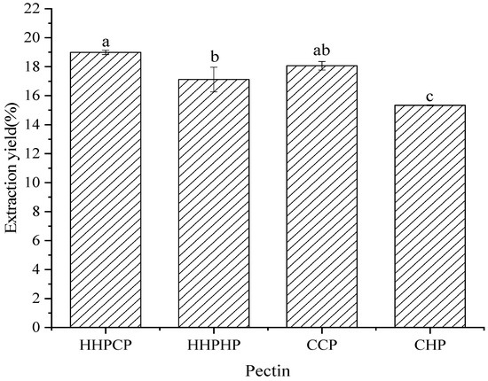 Effect of different extraction methods on extraction yields of Satsuma mandarin peel pectin. Note: different letters (a–c) denote significantly different in the row (p < 0.05).