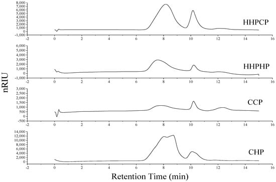 In addition, the Mw value of HHPCP (1201 kDa) was significantly lower than that of HHPHP (2626 kDa) and the Mw value of CCP (1674 kDa) was lower than that of CHP (1871 kDa). These results indicate that citric acid as an extractant resulted in lower Mw values for pectin than hydrochloric acid, especially for HHP-assisted extraction. As discussed above regarding the yields of pectin, HHP could increase the yields of pectin compared to CE. It can be speculated that citric acid may help to chelate Satsuma peel pectin in some lower Mw ranges, while hydrochloric acid may help to extract pectin in higher Mw ranges, and these reactions may be accelerated by high-pressure processing. The effect of acid type on the Mw of pectin has already been reported. The Mw of sunflower pectin obtained by sodium citrate blending was about half the Mw of pectin extracted with oxalic acid-ammonium oxalic acid, suggesting that sodium citrate-extracted pectin underwent a deeper degradation in higher Mw ranges or that sodium citrate helped to extract pectin in lower Mw ranges [28]. Yang et al. [29] found that citric acid-extracted pectin from potato pulp exhibited the lowest Mw compared to those extracted with hydrochloric acid and sulfuric acid. Moreover, HHP may promote the dissolution of low molecular segment pectin or cause deeper degradation of high molecular pectin chains during the extraction process. Peng, Mu, Zhang, Sun, Chen and Yu [17] reported that as pressure increased (250–450 MPa), the Mw of beet pectin showed a downward trend. This could also partly help to explain the significantly lower Mw value for HHPCP. However, the effect of HHP-assisted acid extraction on the Mw of pectin may be complex and needs further investigation in following studies.