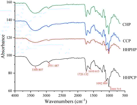 The nature and characteristics of pectin usually vary with different extraction conditions [13]. The GalA content of pectin obtained by different extraction methods is shown in Table 1. It could be observed that the GalA content of Satsuma mandarin peel pectin was 75.35–84.38%, which meets the requirements for commercial food grade pectin (GalA > 65%) [2]. Therefore, Satsuma mandarin peel pectin can be used as a promising source of commercial food-grade pectin. Moreover, there were no significant differences in GalA content for HHPCP, HHPHP, CCP and CHP, indicating that different extraction conditions had less noticeable effects on the GalA content. These results were consistent with a study on the effects of HHP (200 MPa/5 min) treatment on the GalA content of potato peel pectin [18]. Similarly, compared with apple pectin, there was no significant difference in the GalA content of the pectin after different pressure treatments (200, 400, 600 MPa), indicating that the main chain of pectin did not change [22].