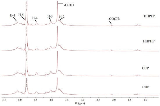 The 1H NMR spectra were obtained based on the method previously described by Xie et al. [18]. Pectins were mixed with D2O and trisodium phosphate (TSP) (0.05%, v/v) at a concentration of 20 mg/mL at 298 K. 1H NMR spectroscopy was performed using a Bruker Avance III 600 MHz spectrometer (Bruker Technologies, Rheinstetten, Germany).