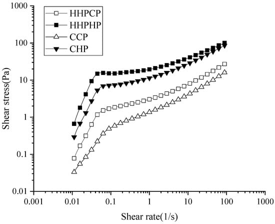 As shown in Figure 5, the shear stress of different pectin solutions increased with the increase in shear rate. Apparent viscosity refers to the ratio of shear stress to shear rate of a fluid during shearing. It can be deduced from the results that the apparent viscosity of the pectin solutions decreased with the increase in shear rate. All pectin solutions were non-Newtonian pseudoplastic fluids, exhibiting shear thinning behavior. Similar results for rheological characteristics were reported for lime peel pectin [25], sugar beet pectin [17] and mango peel pectin [2].