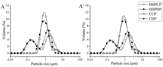 Particle size distribution of different pectin emulsions freshly prepared (A) and after storage (A’) at 4 °C.