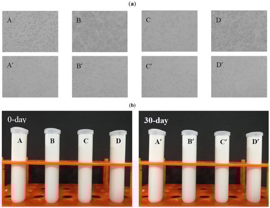 (a) Light micrographs of emulsions prepared by different extraction methods on day 0 and day 30 of storage (40×). (b) Stability of the O/W emulsions prepared by different extraction methods on day 0 and day 30 of storage. (A and A’: HHPCP; B and B’: HHPHP; C and C’: CCP; D and D’: CHP).